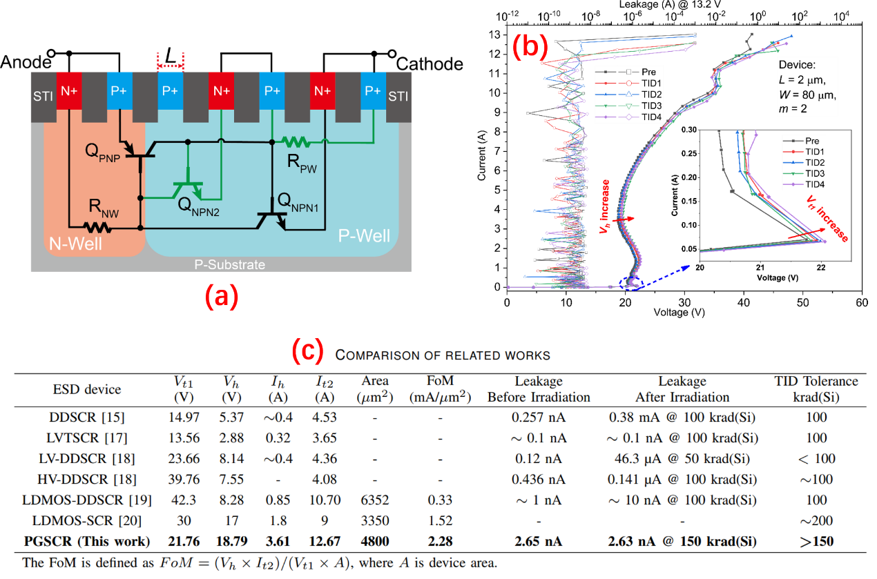 近日,满冠正规平台金湘亮教授研究团队在国际电子器件领域顶级期刊IEEE Electron Device Letters上发表了题为“Total-Ionizing-Dose Tolerant SCR Devices with High Holding Voltage for ESD Protection”的研究论文(DOI: 10.1109/LED.2024.3477452),学院博士研究生刘煜杰为第一作者,刘小年老师和金湘亮教授为论文通讯作者。