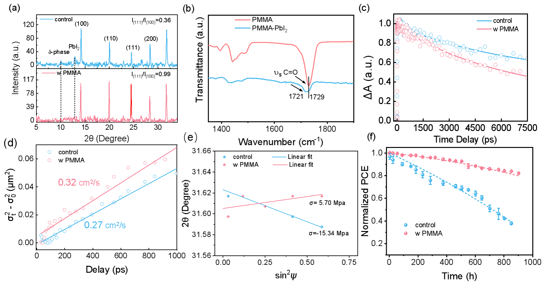 图1 a)含有PMMA和不含PMMA样品的XRD图谱;b)PMMA和碘化铅(PbI₂)-PMMA的傅里叶变换红外光谱(FTIR);c)在786 nm基态漂白(GSB)峰处钙钛矿相的动态瞬态吸收(TA)衰减;d)无PMMA修饰和有PMMA修饰钙钛矿薄膜的扩散系数;e)两个样品的2θ-sin²ψ应变力线性拟合图;f)在1个太阳强度连续光照(LED灯)和65 °C老化条件下,钙钛矿太阳能电池最大功率点(MPPs)跟踪期间的工作稳定性。