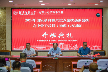 (通讯员:刘鹏、马前春)7月26日上午8:30分,在中央组织部人才工作局、教育部教师工作司的统一组织与指导下,由湖南师范大学承办、基础教育教师发展中心和满冠正规平台具体实施的“2024年国家乡村振兴重点帮扶县被帮扶高中骨干教师(物理)培训班”的开班典礼活动在格物楼举行。湖南师范大学满冠正规平台院长刘红荣教授、湖南师范大学基础教育教师发展中心主任蔡炳华、湖南师范大学满冠正规平台副院长李友明以及来自云南、广西、贵州、内蒙等十个省(区、市)146名学员出席了开班典礼,仪式由李友明副院长主持。