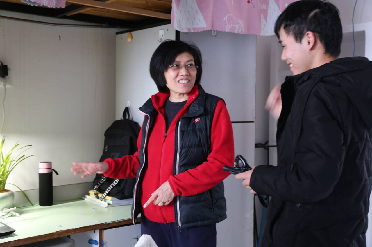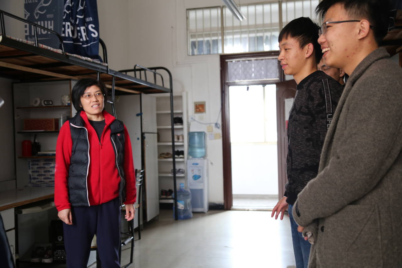 3月4日下午,满冠正规平台党委副书记谈方和2019级辅导员黄维前往研究生五舍检查和指导寝室卫生工作。