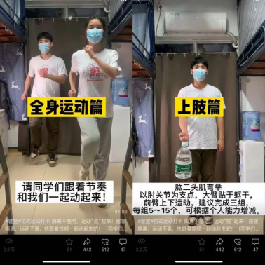 传播正气能量,倡导居寝运动。 为倡导学生们在宿舍积极参与运动,学院辅导员担任领操人,利用网络平台发布短视频,示范适合寝室运动的健康操,包括热身、上下肢运动、核心素质锻炼、拉伸放松等环节,引发师大学生居寝锻炼的热潮。