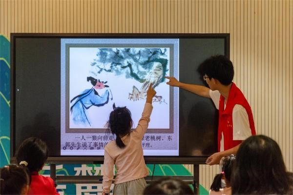 活动开始前,志愿者们协助现场人员进行签到,并负责维持活动秩序。讲解过程中,杨涛图文并茂地为小朋友们讲解了绘本故事《东郭先生》,他采用提问的方式引导小朋友们积极参与,并对积极回答问题的小朋友予以零食奖励,以提高小朋友们参与活动的热情。借此故事,杨涛告诫小朋友们在今后的日常生活中不仅需要树立起安全防范意识,更应该在遇到事情时具有分清善恶、辨别是非的能力。