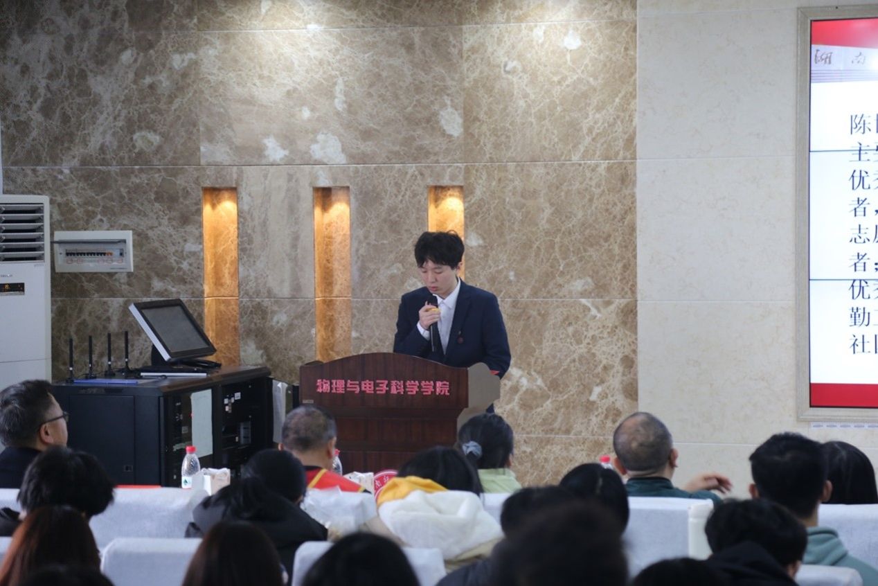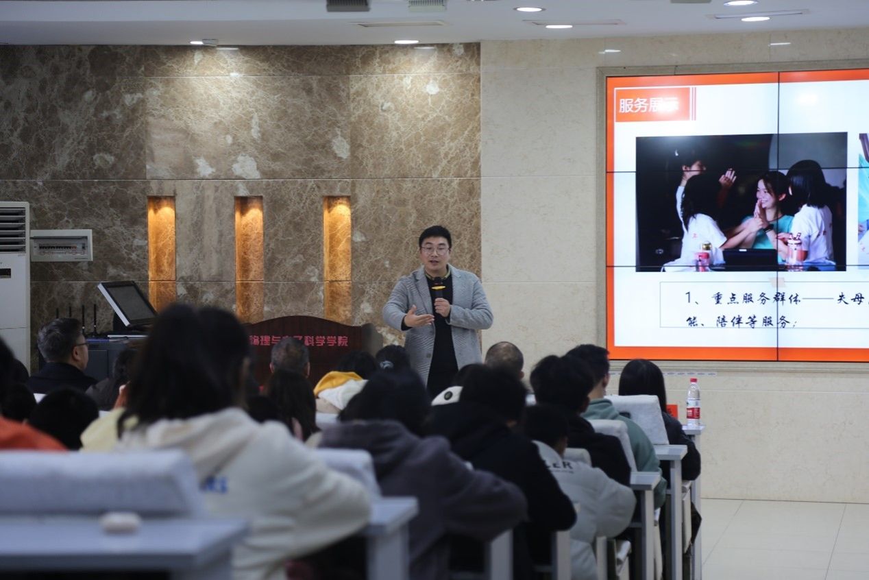 (通讯员 谭烨茜 段楚楚)12月14日中午,物电院团委青年志愿者工作部于理学院509报告厅开展“爱心献社会,真情暖人心”志愿者精神宣讲会。湖南省科学技术馆公众服务部部长周辉军,长沙市博爱阳光家园残疾人托养服务机构退休工作人员袁亮坤(中央文明委授予中国好人,中共中央宣传部授予全国岗位学雷锋标兵),暖心社工机构总干事周平,物电院2021级学生陈博担任主讲人。物电院党委副书记郭铭伟担任点评嘉宾,2023级学生党伟莎担任担任主持人。