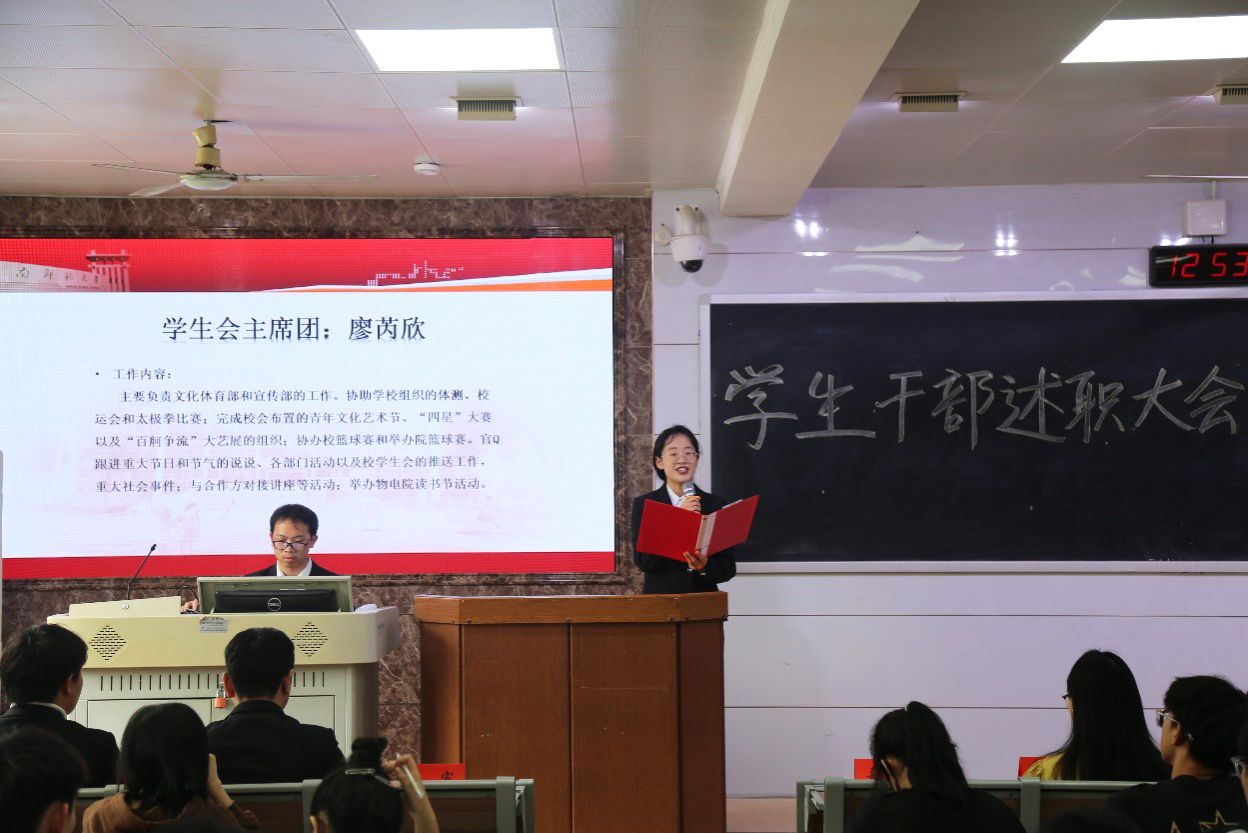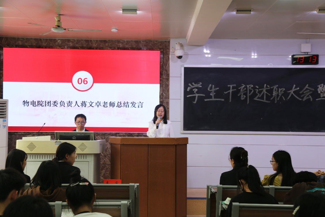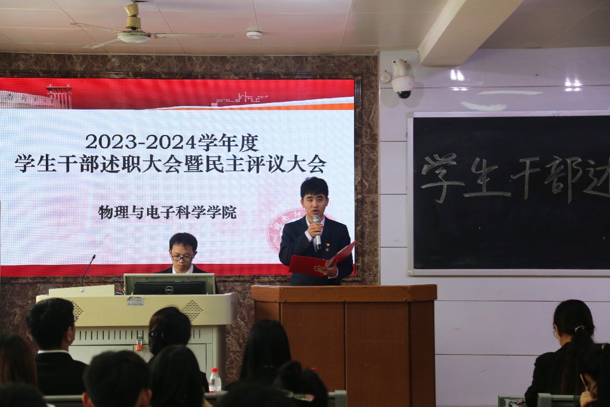 (通讯员 陈泽瑞 黄丹)4月19日中午,满冠正规平台团委青年发展工作部于格物楼109举办2023-2024学年度学生干部述职大会暨民主评议大会。学工办主任黄维,院团委负责人蒋文卓、学社管指导老师滕茂出席此次会议,院团委组织部干事李长春担任主持人。物电院2021级、2022级、2023级各班班长、团支书及学生代表参加会议。