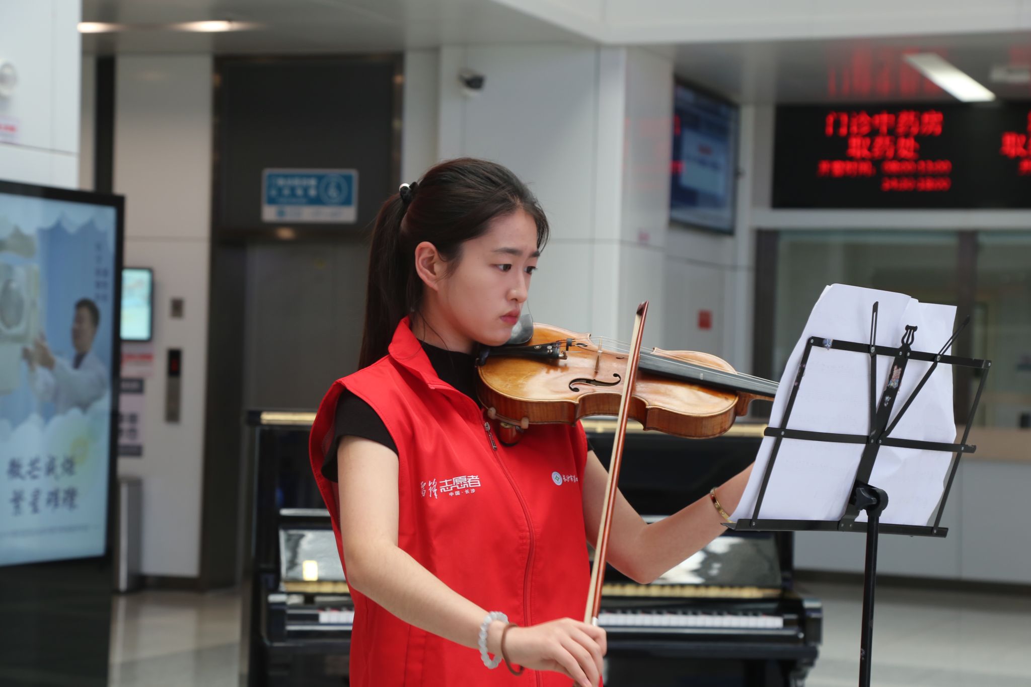 蔡卓凌带领志愿者与社团成员提前到达现场,进行设备试音,合唱排练,布置现场等准备工作。此次音乐会的歌曲包含流行古典等不同风格,演奏形式多样。演奏者周建凯,刘佳琪以一曲《青花瓷》开场,熟悉的旋律从钢琴的黑白键之间缓缓流出,吸引众多行人驻足欣赏。音乐会过程中,参与音乐会的社团成员带来了精彩纷呈的歌曲演奏,优美的旋律与动人的歌声交织在一起,营造出温馨的现场氛围。活动以一首《我会等》收尾,志愿者们与社团成员一齐合唱,表达了对美好的希冀以及对医院患者早日康复的祝福。音乐会正式结束后,现场观众纷纷送上热烈的掌声与欢呼。