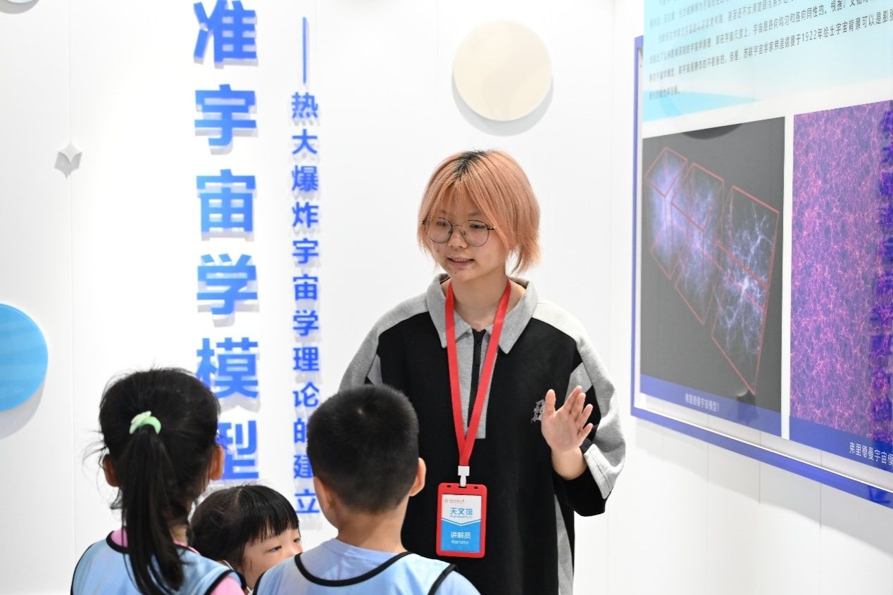 在志愿者们的带领下,参观者们先进入六楼展览厅听讲解员介绍相关板块知识。讲解员从基本的天文知识切入,由浅入深地讲解了恒星演化、黑洞形成、西方八十八星座等天文知识,并详细介绍了中国古代天文学发展史。参观者们进入七楼,讲解员通过讲解傅科摆原理引入地球自转话题,讲解了宇宙大爆炸、弗里德曼三大模型、宇宙物质形成及暗物质暗能量等天文学相关知识。随着参观过程的推进,参观者们跟随讲解员来到天文馆八、九楼学习望远镜的构造以及太阳系的基本结构,并在讲解员及志愿者的指导下于室外用望远镜进行了观测。