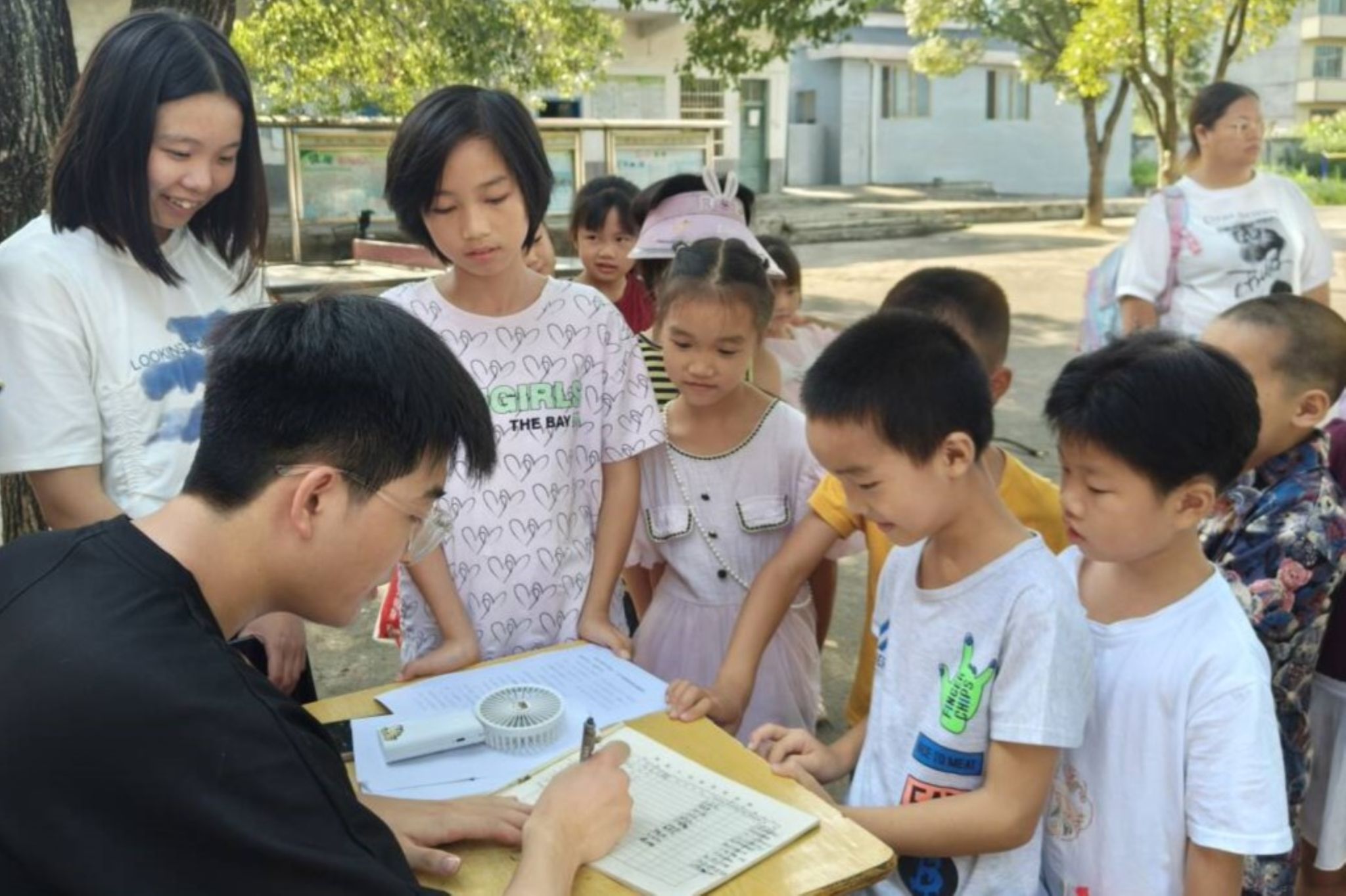 7月8日上午,支教队于炉子小学操场为学生办理暑期课程入学手续。支教队成员樊仲华、张梁宇负责登记其余成员负责维护学生纪律。学生们依次在登记册上写下个人信息。支教队队长周柏成负责监督学生信息的完整记录,并为完成登记的学生发放安全承诺书。其余队员在维护纪律的同时,与学生们互相交流,增进感情。
