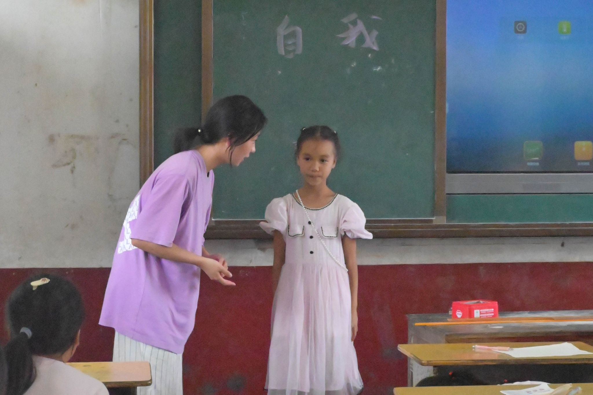 7月8日下午,入学第一课正式举行。学生们被分为两个班级。支教队成员刘娟、殷梓萱等人组织小朋友们进行自我介绍。为拉近与小朋友之间的距离,多名支教队成员率先介绍自己,他们在黑板上写下自己的名字,并向小朋友阐述自己的理想。学生们受到队员们的鼓舞,也大胆地上台进行介绍自己和未来的目标。