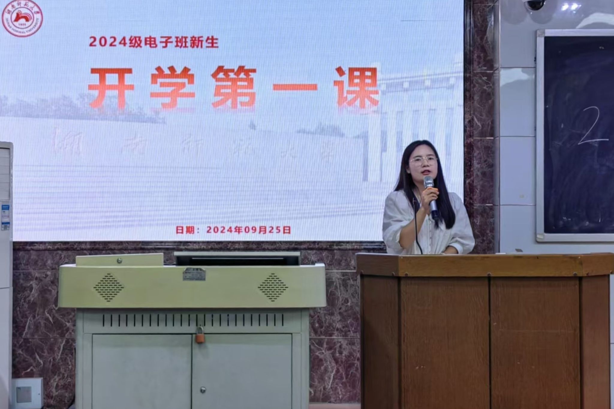 (通讯员 黄浩男)9月25日晚,满冠正规平台(以下简称“物电院”)2024级电子班于格物楼109教室开展新生专业教育讲座。电子班班导师唐娇主持会议。物电院2024级辅导员戴文纯、物电院电子系教授金湘亮出席讲座。