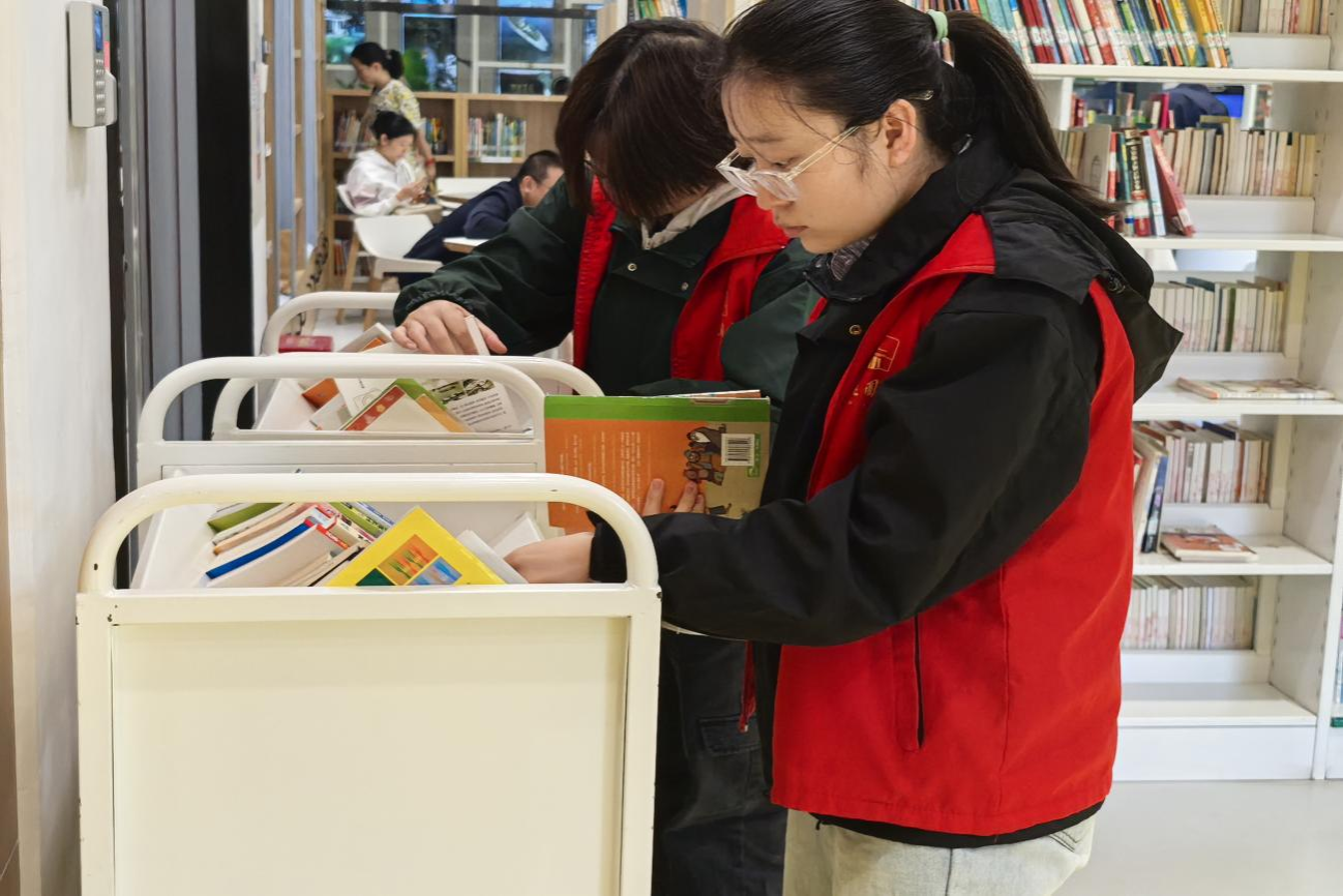 在馆内图书管理员的指导下,学生志愿者迅速了解注意事项并被分为三个小组,第一组负责书籍的整理及搬运,第二组负责书籍的扫码入库,第三组负责将书籍整理归位。在志愿者们的紧密协作下,原本杂乱无章的书籍逐渐排列得井然有序。志愿者们时刻注意保持安静,轻手轻脚地搬运书籍,推车行进时也尽量减缓速度,以免干扰到其他读者的学习与阅读。
