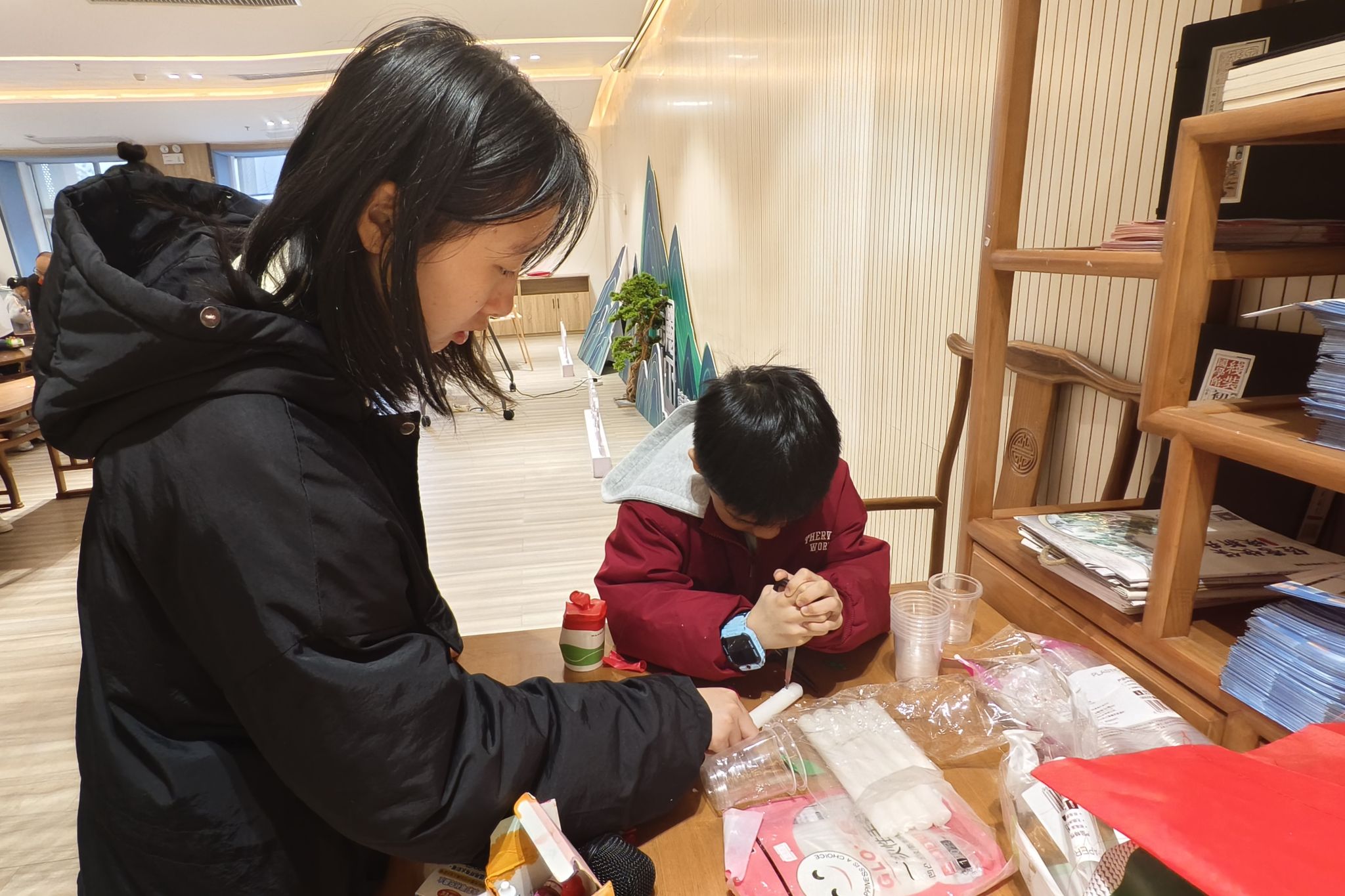 志愿者指导小朋友做实验