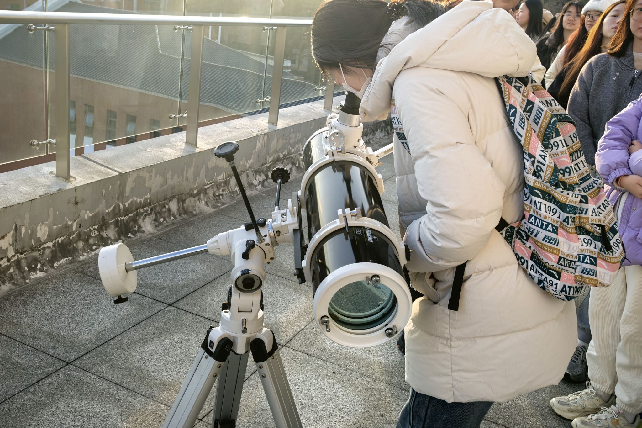 讲解员从中国古代天文学发展史开始讲解,结合图文阐述了二十四节气的由来以及中国古代的奇异天象。为引导参与者们积极思考,讲解员在讲解恒星的一生时提出了有关黑洞的问题,并结合黑洞图像,用通俗易懂的语言向参与者们进行了解答。此外,讲解员还通过演示傅科摆设备讲解了如何利用傅科摆证明地球的自转。活动最后,参与者们参观了顶层的口径为40厘米的折返式天文望远镜,讲解员向参与者们展示观测拍摄的照片。