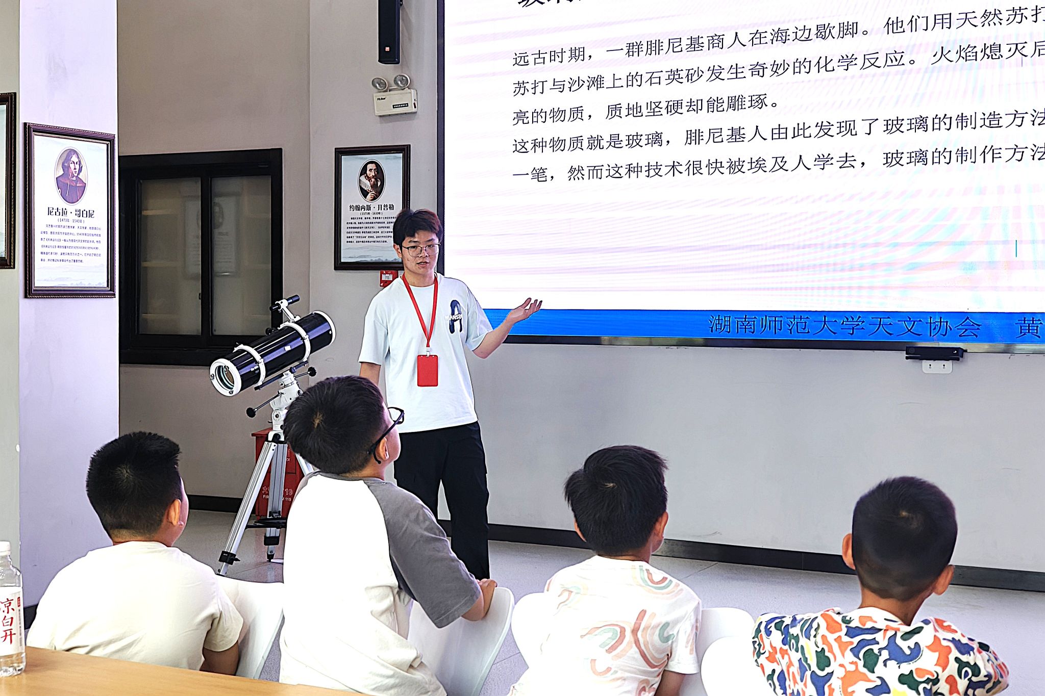 课堂伊始,讲解员讲述了玻璃的诞生故事。玻璃的演变史巧妙串联起望远镜核心镜片材料的发展脉络。随后,讲解员拆解望远镜的结构密码,细致讲解了物镜汇聚光线、目镜放大成像的工作原理,引出了世界上第一架望远镜的诞生,为孩子们讲解了望远镜的发展历程。为深化理解,讲解员聚焦折射式、反射式、射电望远镜三大类型展开科普,通过形象的比喻和实例,分别解析了每种望远镜的工作原理,同时还客观分析了它们的优缺点。活动的最后一个环节是指导孩子们尝试制作简易望远镜,在实践中理解望远镜的构造原理,同时培养大家的动手能力和科学思维。