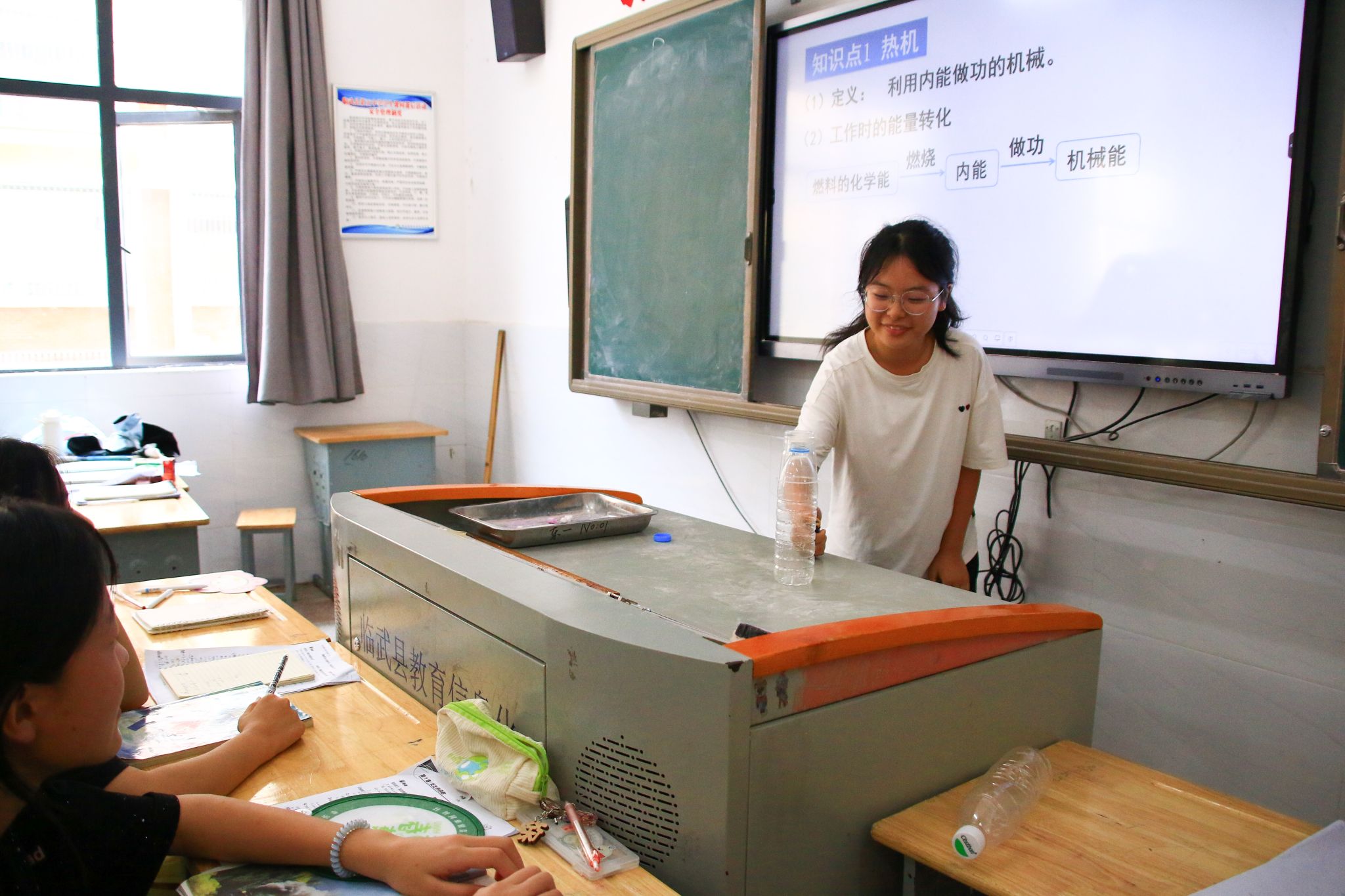 该课程是实践队科普支教系列活动之一。主讲人胡贤伟、伍坤准备了塑料瓶、玻璃管、酒精及点火器等简易实验器材。在演示环节中,他们先向密封装置内缓慢打气,随着气压逐渐升高,瓶塞瞬间弹出,借此生动阐释内燃机四冲程中的压缩冲程。随后,在可控状态下,他们用点火器引燃装置内的酒精燃料,燃料燃烧产生的能量推动模拟活塞运动,直观展示了做功冲程的原理。完成关键步骤演示后,主讲人着重强调安全操作要点,如保持合适距离、规范使用点火器等。多名学生应主讲人邀请上台,亲自体验趣味实验。他们在主讲人指导下操作器材,观察实验现象,进一步加深了大家对内燃机四冲程基本概念的理解。整个过程严谨有序,兼具知识性与趣味性。