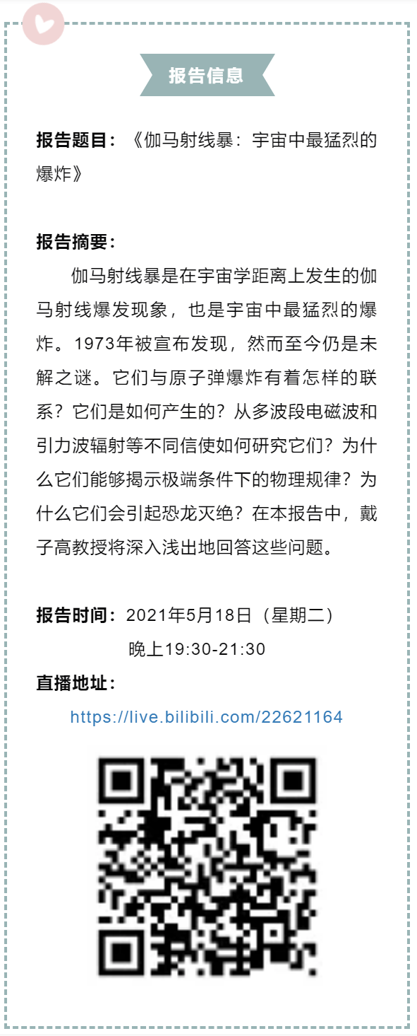 5月18日晚上19:30,戴子高教授将在我院(满冠正规平台)格物楼509报告厅带来一堂讲座—《伽玛射线暴:宇宙中最猛烈的爆炸》。届时,师大天文馆将在B站进行同步直播。