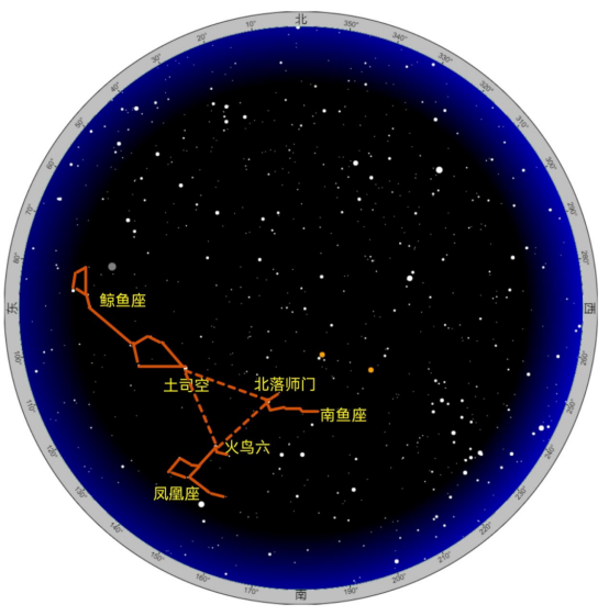 在鲸鱼座南方的是凤凰座,几颗星围成一个菱形组成了凤凰的身躯,凤凰向西南和西北方向伸出两个翅膀,西北方向的翅膀中间一颗亮星,就是火鸟六。