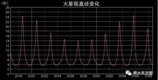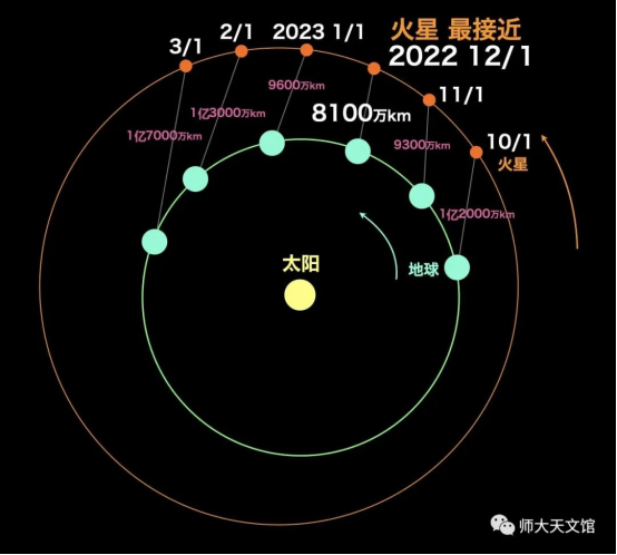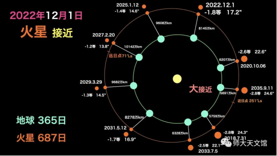 火星是地球的近邻,它的运行轨道在地球的运行轨道之外,火星公转周期为687地球日,火星和地球相互接近的时间间隔约为两年零50天。2022年12月1日10时17分火星最接近地球(准接近),为:0.544474430AU(天文单位)、8145万2214公里,视直径17.2角秒,视星等-1.8等。下一次火星接近地球在2025年1月12日22时,距离为0.642282544AU、9608万公里,也属于准接近。