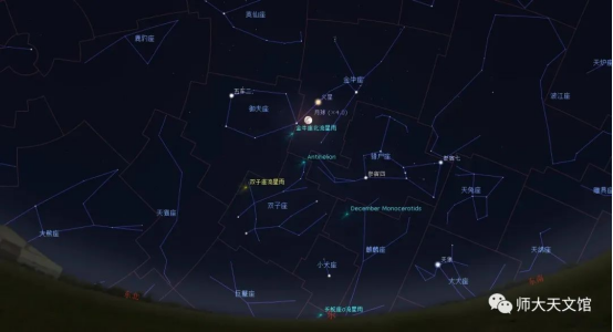 12月8日02:43火星合月(视赤经4h58m38s),地心所见火星在月球以南0.54度(在欧洲、北美可见月掩火星);12:08望(满月);13:42火星冲日,视直径17.0角秒,视星等-1.9等,位于金牛座,是观察火星的最佳时机。冲日和最接近地球的日期(12月1日)不一致是因为火星的轨道偏椭圆。