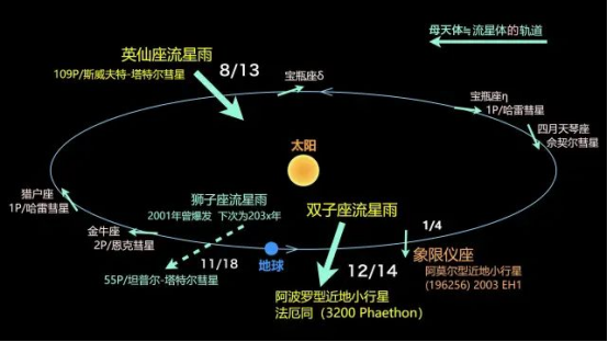 年度三大流星雨之一的双子座流星雨(Geminids,00004 GEM),是来自3200号近地小行星法厄同(3200 Phaethon)轨道上的屑粒所衍生的。它将于12月4日至12月20日之间发生 。今年预计在12月14日21时达到极大期。届时,ZHR(天顶每时出现率)将达到150,1小时可见20~30颗流星。