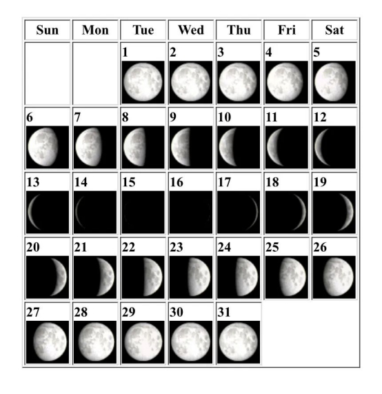 当月球绕地公转周期逐渐进入尾声,亏凸月会逐渐变细,直到太阳光再也无法抵达月球。在稍后的一天内,太阳与月球便会于8月16日达到最近距离。此时的月相称为新月,于是新一轮为期 29.5 天的月相循环又开始了。月亮相对太阳的位置,每晚都会比前一晚偏离12° 以上。这意味着,月亮每晚都比前一晚迟一小时落下。大约一周,便进入上弦月阶段。
