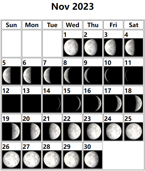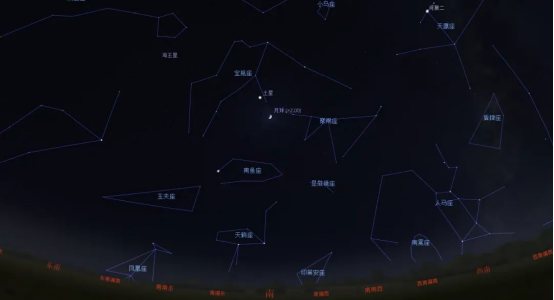 11月20日18:50上弦,年度最大上弦月。22:06土星合月(视赤经22h13m40s),地心所见土星在月球以北2.73度的地方。18点左右朝南方天空观看。映入眼帘的是上弦月,辉面比为0.50,土星在它的上面,间隔约5度,随着时间的流逝,会逐渐接近,但高度也下降了。