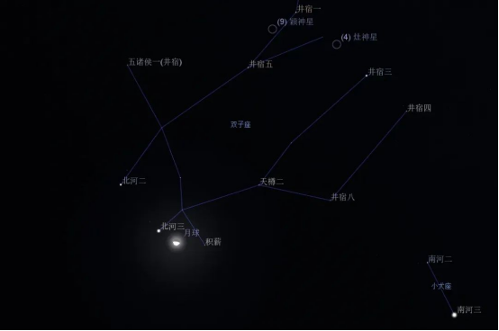 11月4日凌晨03:09北河三合月(视赤经7h46m46s),地心所见北河三在月球以北1.45度的地方,合月时可见!可以看到双子座头部的北河二、北河三与亏凸月三个天体排列成一线。双子座是黄道星座之一。最亮星北河三(双子座β星),视星等+1.14等,距离地球34光年,是一颗橙色巨星,颇引人瞩目。