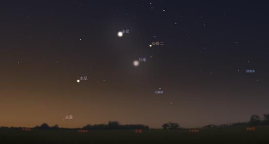 1月9日04:10金星合月(视赤经16h43m41s),地心所见金星在月球以北5.70度的地方。
