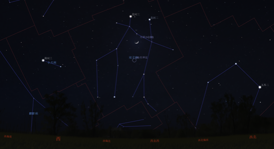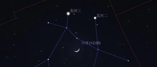 2024年5月13日06:54北河三合月(视赤经7h46m47s),地心所见北河三在月球以北1.58度的地方,不过此时无法看见。5月12日日落后的西方天空,可见月龄4.6的蛾眉月与北河三、北河二形成“迷你笑脸”。