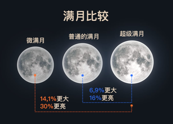 对于地球上的观察者来说,超级月亮看起来比“普通”满月大7%且亮16%。