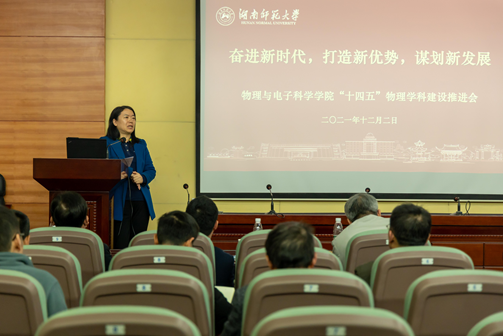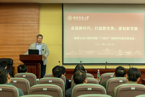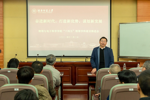 学校职能部门领导分别讲话,对物理学科“十三”期间取得的成绩表示充分肯定,并表示将全力支持物理学科建设和发展。人事处鲁良处长表示,学校将采用“一人一策”进一步加强物理学科高层次人才引培进力度,并强调将进一步营造良好的学术氛围,激发现有科研人员的创新活力。发展规划处孙岳兵处长表示,学校“十四五”将加大投入,支持物理学科的建设,并就重大成果培育、国家级科研教学成果奖申报和高层次人才培育等提出了指导性建议。科技处马铭处长指出,物理学科可以抢抓岳麓山大学科技城和湖南省实验室建设的契机,坚持四个面向,突破学科发展面临物理空间和建设经费不足等瓶颈问题。