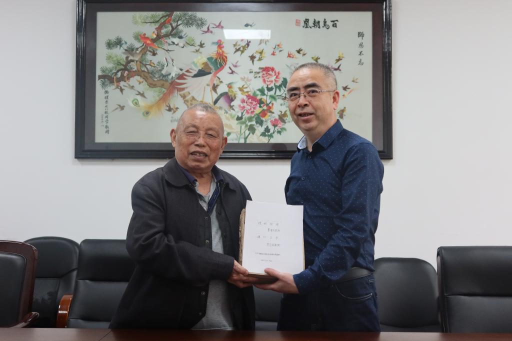 康洪、谈方代表学院热烈欢迎荆家修校友返校,并感谢荆家修校友赠送珍藏资料。