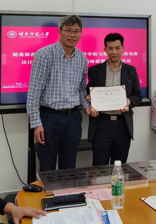 唐东升院长代表学院热烈欢迎联盟领导和企业代表到访湖南师范大学,并介绍了学院的物理与电子学科的发展与双一流建设情况。他表示,学院与企业的校企合作空间很大,可从科学研究、人才培养与社会服务等方面开展深度合作。钱盛友副院长介绍电子系近年来取得的创新成果及成绩:电子信息科学与技术专业获批2020年度国家一流专业建设点,获得湖南省电子信息技术与应用研究生创新基地和微纳器件与集成省级校企合作创新创业教育基地等多个省级平台。唐院长和康书记分别为校外研究生导师颁发聘书和完成产学研基地授牌仪式。