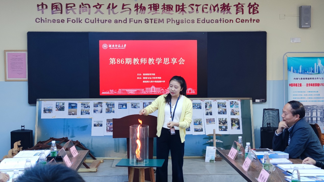 李湘黔以“中国民间文化与物理趣味STEM教育课程体系建设与思考”为主题,分享了自己教学工作的心得体会,以其主讲课程《中国民间文化与物理趣味STEM教育》为例,介绍湖南师大附中梅西湖中学STEM教育校本课程建设,教学团队打造,实验项目设计所付出的艰辛和努力。作为湖南省青少年STEM教育科普基地负责人,他邀请湖南师范大学物理师范专业本科实习生彭慧同学为大家展示了火焰龙卷风实验现象并阐述了其背后的物理原理与规律;亲自上阵为大家揭示了空竹蝉鸣的物理玄机;分享STEM教育项目设计的经验;以其亲身经历对比中西方文化教育差异提出独立见解与思考。