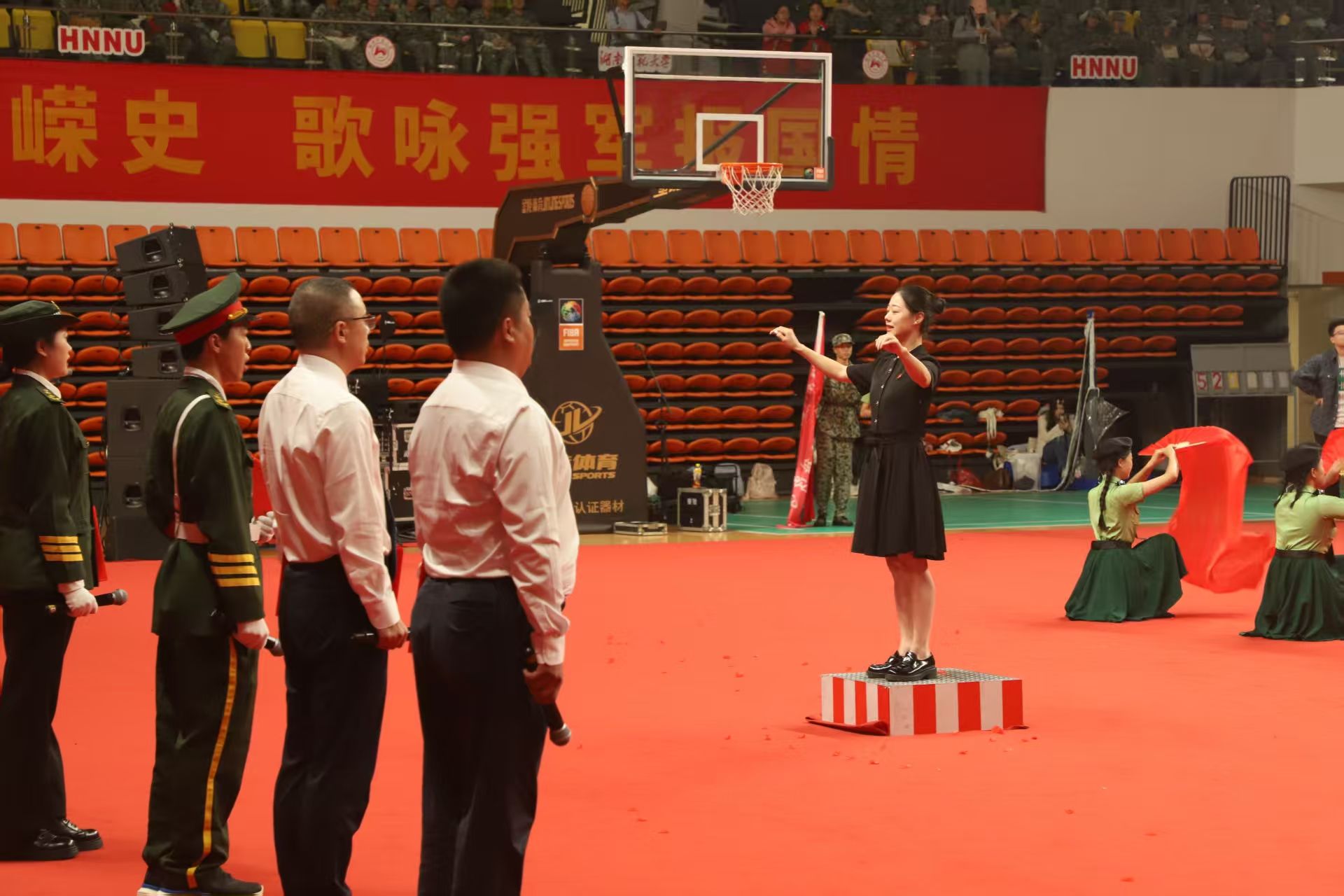 在院2025级辅导员朱江美的指挥下,院合唱团的新生们一齐高唱,用歌声表达出保卫祖国的担当和热血战士的激情。学院院长刘红荣、院党委副书记郑智参与朗诵,回顾革命先辈的峥嵘岁月。同时,前排的舞蹈队员动作刚劲有力,舞姿优美舒展,一招一式展现军人的坚毅和果敢。嘹亮的歌声、律动的舞蹈与激情的朗诵交相辉映,展现了物电院学子扎实的艺术功底与团队协作精神,同时通过多元艺术形式传递了爱国情怀与英雄气节。