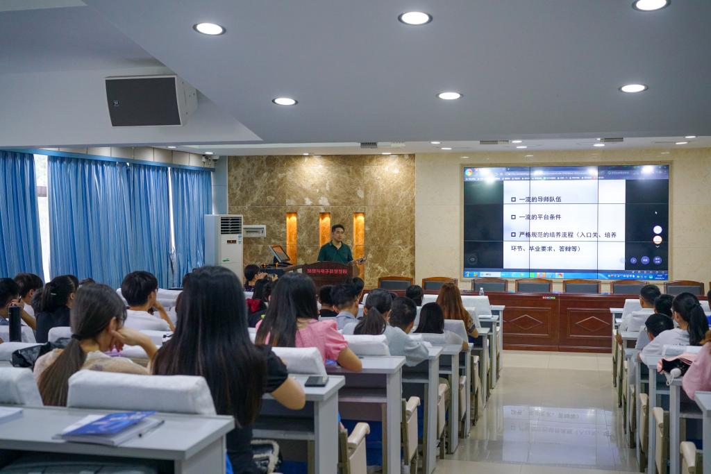 首先,欧阳钢副院长对研究生新生的到来表示了热烈的欢迎,并介绍了学院的师资力量、各专业导师情况、课程情况和完善的奖助体系,强调了我院各专业就业前景可观,在全校各二级学院毕业生就业率排行中位居前列。接着,欧阳钢副院长围绕学术道德、学术规范、安全方面进行了教育,告诫研究生新生要勤奋执着、脚踏实地、勤于思考、勇于创新,强调了学术不端的严重性,勉励同学们珍惜学习时光,努力做出科研成果,以优异的成绩完成学业。