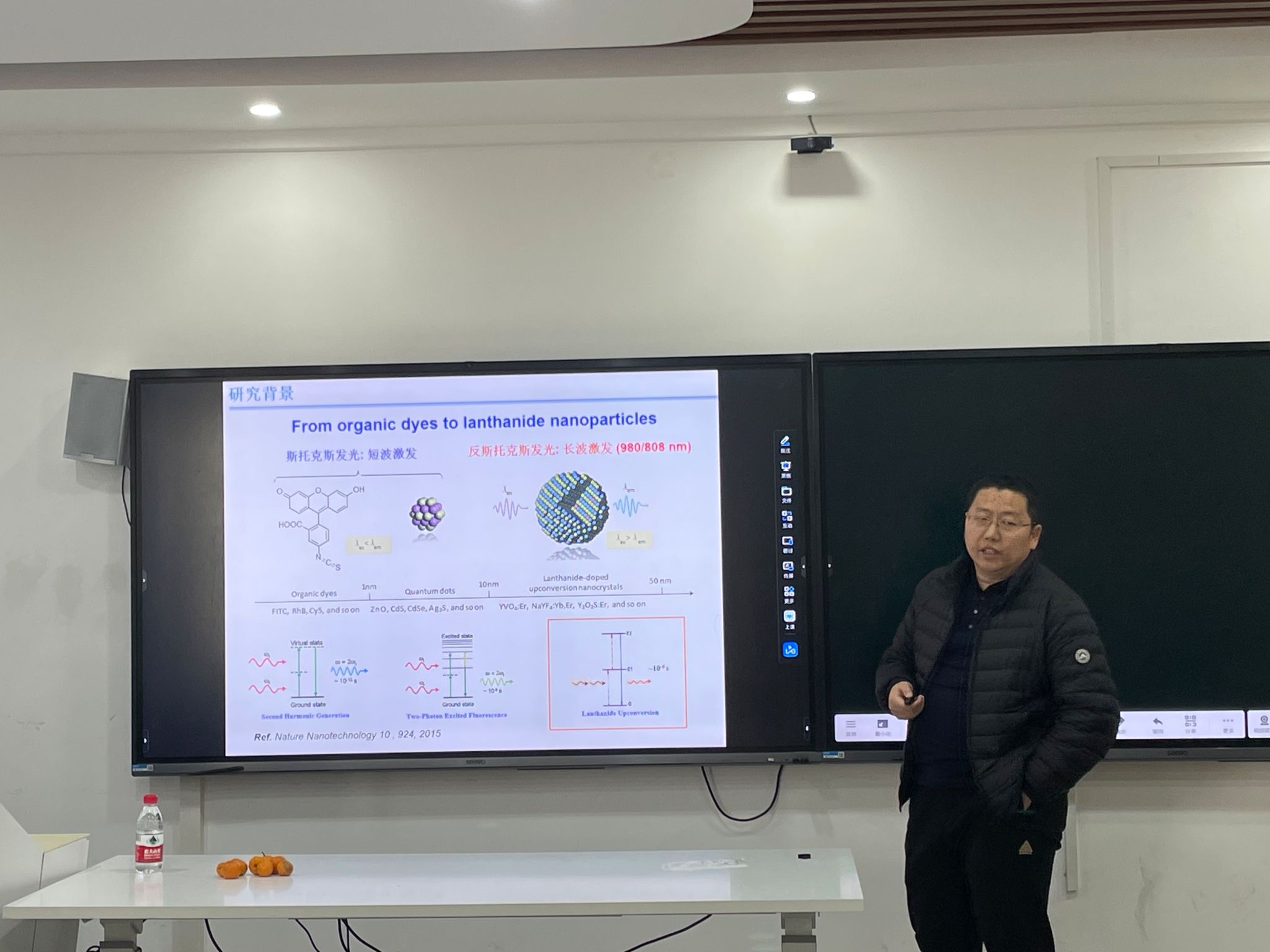 曾教授围绕“多功能光学纳米探针的设计及其成像和传感应用”这个主题从研究背景、研究方向和研究成果展开报告,详细介绍了以下三个研究成果:(1)高灵敏、高分辨NIR光学探针设计;(2)激活型NIR-II光学探针设计及传感应用;(3)纳米闪烁体-X-ray触发的气体治疗及PDT应用。曾教授报告深入浅出,逻辑清楚,在场师生收获颇多。