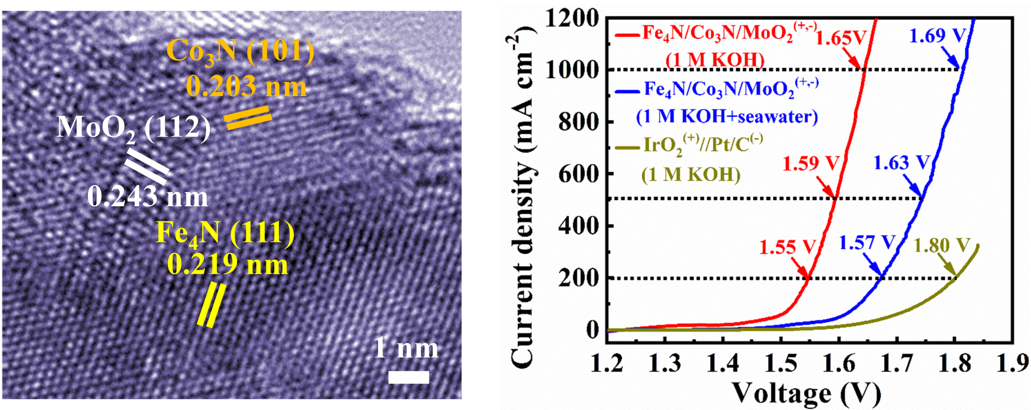 近日,校定TOP期刊Advanced Materials在线发表了我院周海青、余芳、唐东升教授等人合作的学术论文“Complementary multisite turnover catalysis toward superefficient bifunctional seawater splitting at ampere-level current density”。该研究成果从电解水/海水制氢的工业化应用角度出发,从宏观和微观角度在金属氮化镍表面原位生长多金属活性位点(Fe、Co、Mo)、多功能组分的多级异质结催化剂,协同促进碱性电解水/海水反应中间体(水分子、活性氢、含氧中间体)的吸附/脱附,可控开发了兼具优异析氢、析氧活性的双功能海水电解催化材料。将其耦合成全解水器件,该器件仅需要1.65/1.69 V的槽压就能产生安培级电流密度1000 mA/cm2,且在大电流密度500 mA/cm2稳定运行200小时以上,其槽压仅发生微弱变化21/28 mV。甚至利用该异质结材料组装膜电极器件,也能在真正工业制氢环境(6 M KOH,85oC)下以500 mA/cm2电流密度稳定运行超过80小时,展现出一定的应用前景,这为大电流碱性海水制氢提供了技术指导。