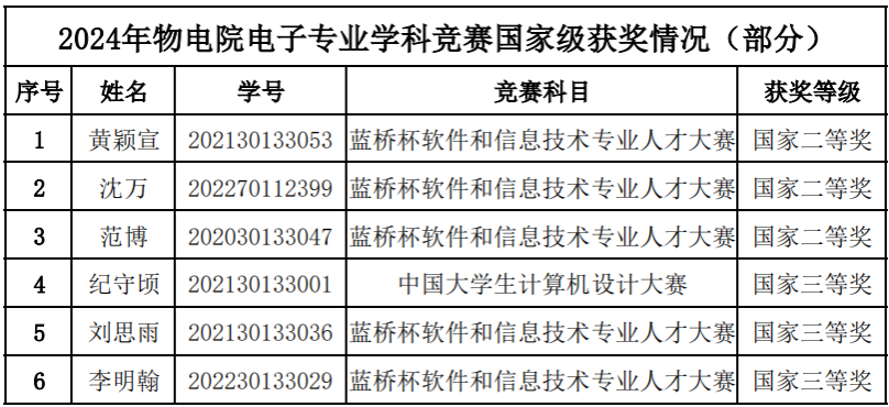 近期,我院电子专业学生积极参加多项国家级和省级学科竞赛,先后在第十五届蓝桥杯全国软件和信息技术专业人才大赛总决赛、第十七届中国大学生计算机设计大赛中南地区赛、全国总决赛和2024年湖南省大学生电子设计竞赛中取得了优异的成绩,共获12项奖励,其中国家二等奖3项、三等奖3项,湖南省一等奖1项、二等奖1项、三等奖4项。
