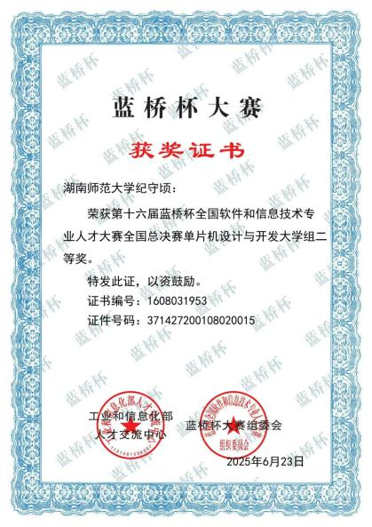 近日,我院本科生和研究生参加了两项国家级学科竞赛,先后在第十六届蓝桥杯全国软件和信息技术专业人才大赛、2025年TI杯全国大学生电子设计竞赛中取得优异的成绩,共获得国家一等奖1项、二等奖3项、三等奖8项,湖南省一等奖14项、二等奖9项、三等奖14项的好成绩。
