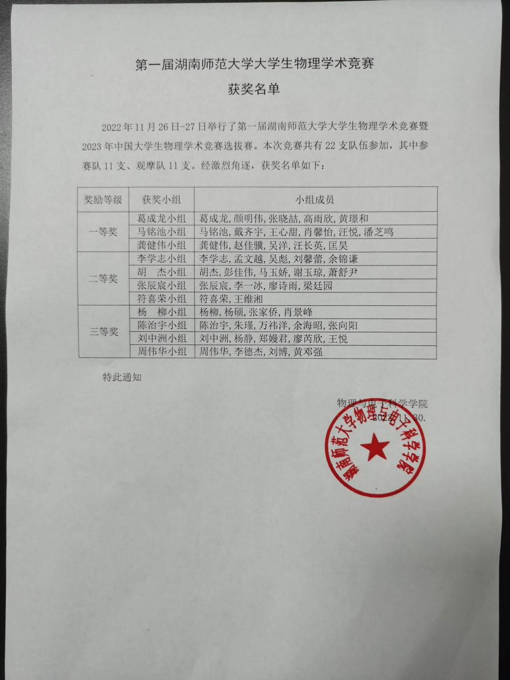 第一届湖南师范大学大学生物理学术竞赛获奖名单