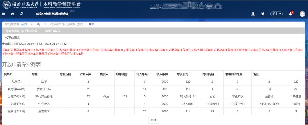 4、选择转专业条件后,在转入院系专业字段,选择自己想要转入的院系专业,按照要求填写下方所需信息后,点击【申请】按钮提交申请。
