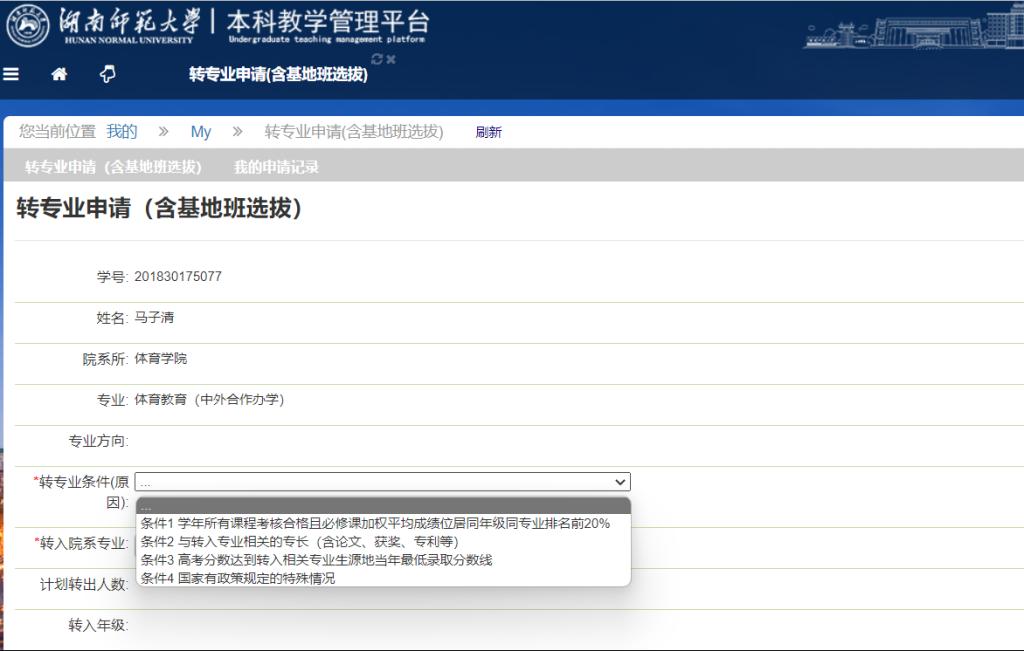 3、在申请界面,首先选择我们的转专业条件(原因),若是选择条件1则需和学院联系确认专业排名后输入排名信息,再提交;若是选择条件2、条件3、条件4则需上传附件材料。