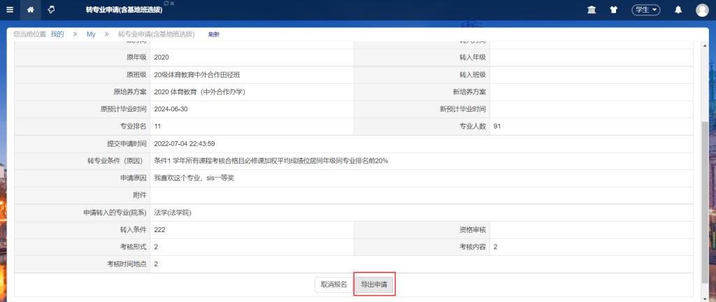 5、点击【申请】,申请成功后会提示申请成功并跳到如下界面,可以导出申请,在申请表上完善相关信息(注意要勾选转专业条件)后打印签字提交学院。